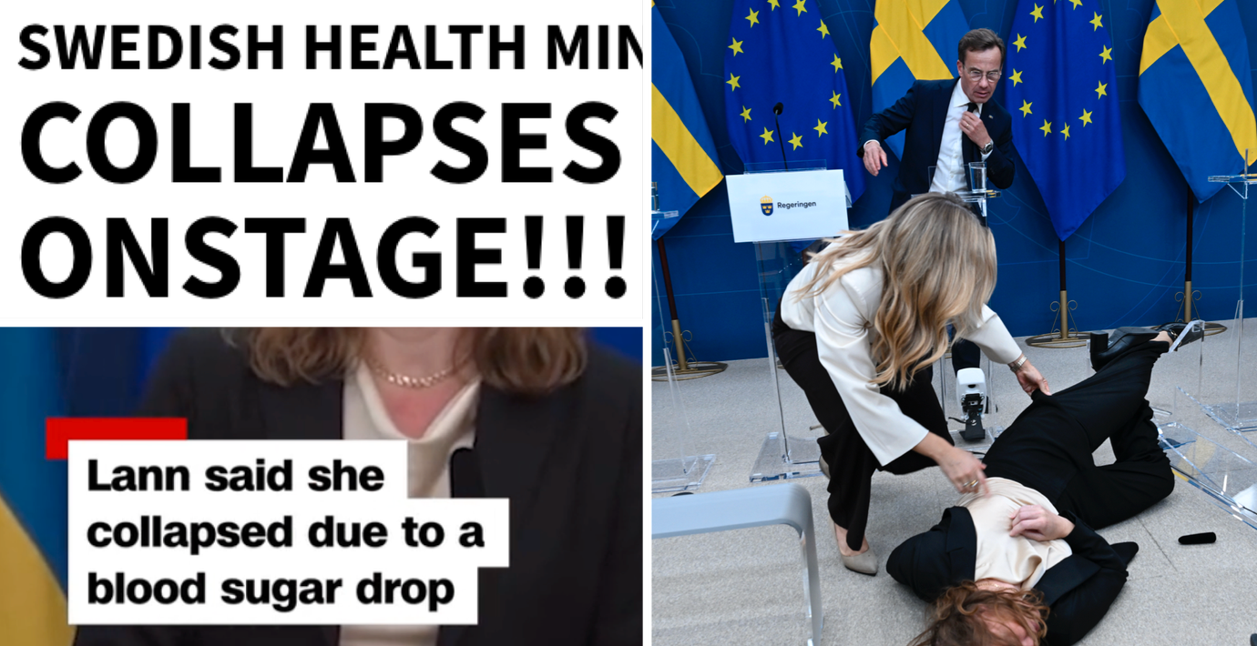 ”Här är det dramatiska ögonblicket när Sveriges nytillträdda minister plötsligt kollapsar mitt under regeringens pressträff”, skriver Daily Mail.