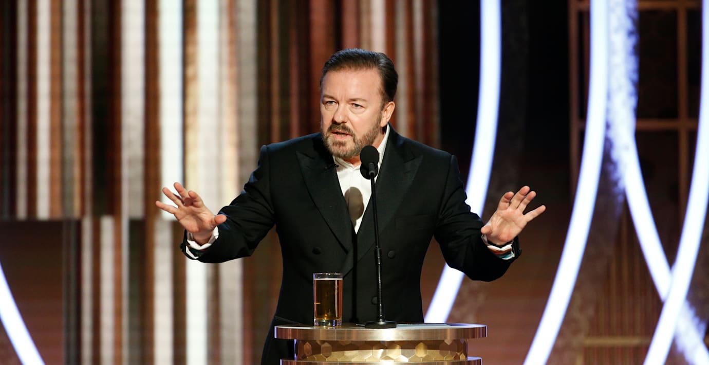 – Det är sista gången jag leder det här, så jag bryr mig inte längre. Jag skämtar bara, jag brydde mig aldrig. Det gör uppenbarligen inte NBC heller, säger Gervais.