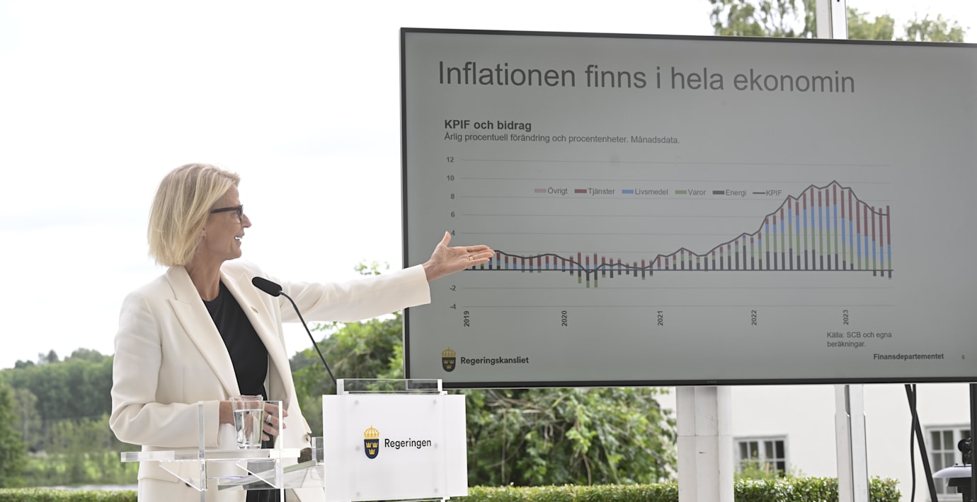 Den svaga kronan är en delorsak till den höga inflationen, men enligt finansminister Elisabeth Svantesson (M) är den svenska valutan undervärderad. Det säger hon vid en pressträff om det ekonomiska läget.