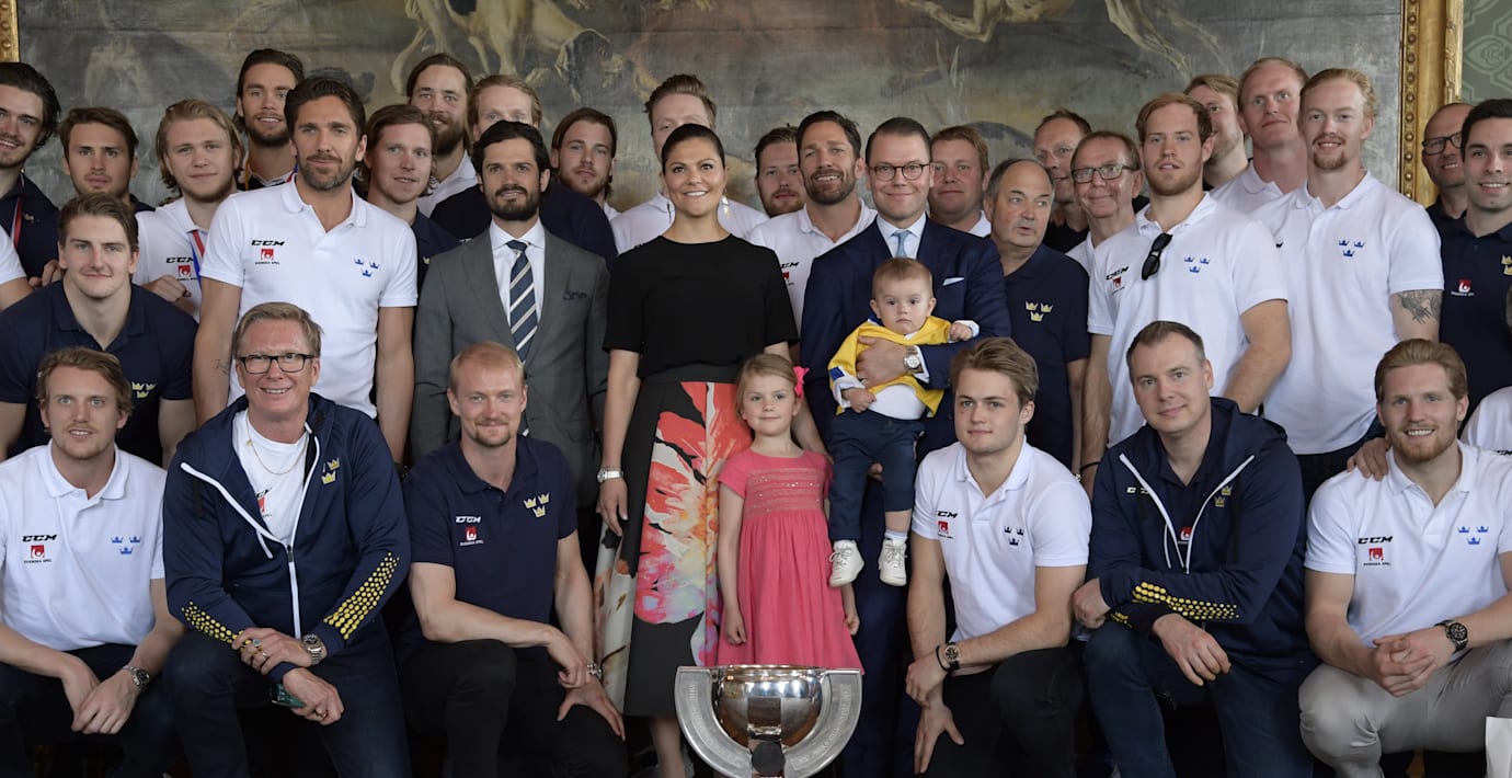 Tre Kronor hyllas kungligt efter VM-triumfen. Guldhjältarna besökte i eftermiddags Stockholms slott för att träffa kronprinsessan Victoria och prins Daniel med barn samt prins Carl Philip. Guldbucklan var med i rummet när laget samlades för en gruppbild med kunligheterna. Prinsessan Estelle skakade hand med spelarna och ettårige prins Oscar hade dagen till ära en svensk landslagströja på sig.