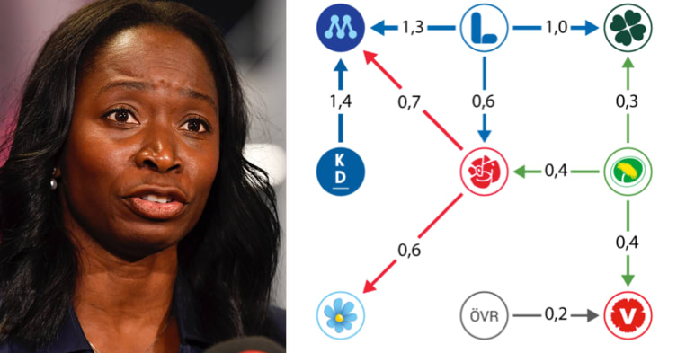 Sedan valet 2018 har partiet tappat väljare åt alla håll, visar siffrorna. Nettoflödet till Moderaterna är 1,3 procentenheter, till Centerpartiet 1,0 procentenheter och till Socialdemokraterna 0,6 procentenheter.