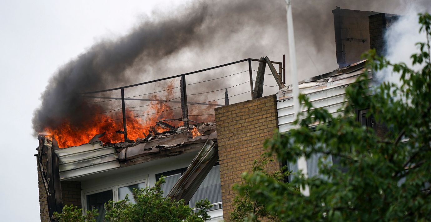 Elden startade i åttavåningshusets vind och spred sig snabbt över hela taket. Branden är släckt men riskerar att blossa upp igen, skriver Aftonbladet.