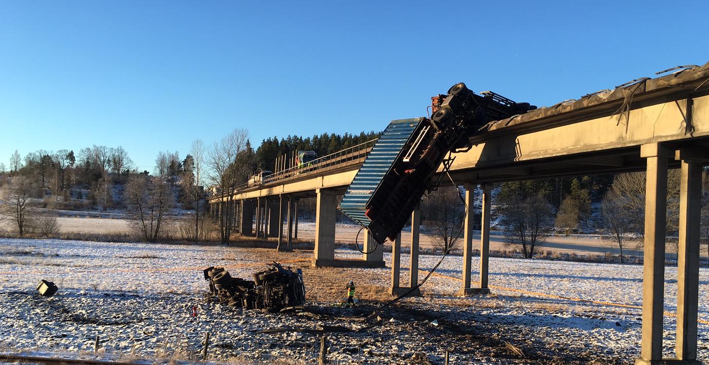 Lastbil hänger över bro – E22:an avstängd