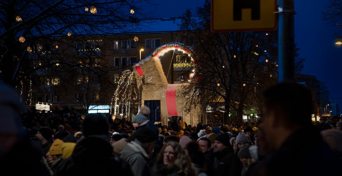 Den lilla bocken av halm som står på Slottstorget i Gävle brann i natt, rapporterar Expressen. En person har omhändertagits, efter att vittnen pekat ut honom som skyldig. Han togs för fylleri och ska höras senare.