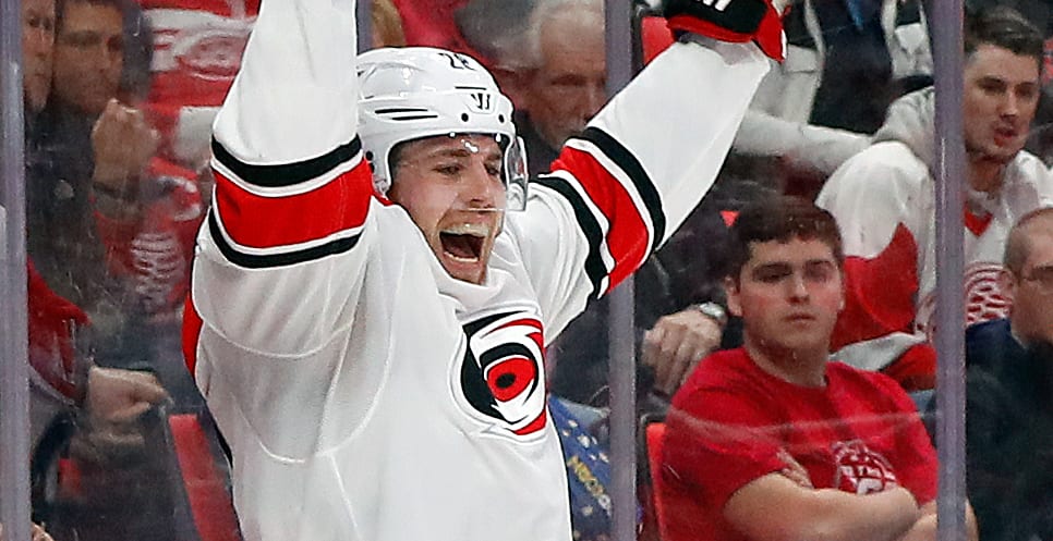 Carolinas Elias Lindholm stod för två mål vid 3–1-segern mot Detroit borta i Little Caesars Arena i NHL-mötet i natt. Båda kom i numerärt överläge.