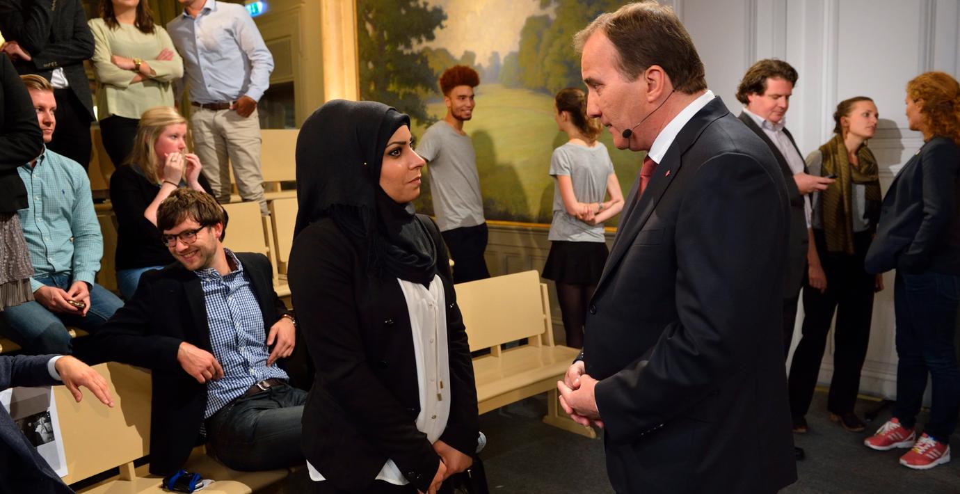 – Du pratar ju perfekt svenska. Det som drabbar dig är hur du är klädd. Jag ska inte säga till dig att det bara handlar om lagstiftning. Det finns rasister som inte bryr sig om det. Men jag är stolt att jag och Löfven står här sida vid sida och står upp mot rasism, sa Reinfeldt.