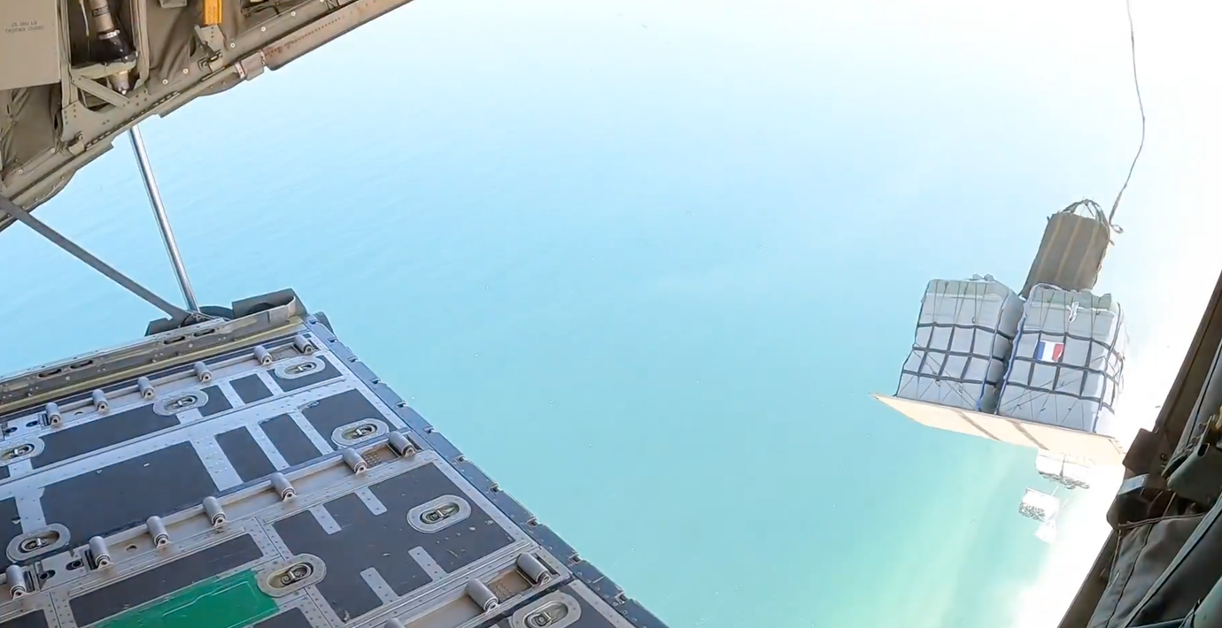 I en video som Macron publicerat på X syns fyra lådor försedda med franska flaggor släppas ut ur flygplan.