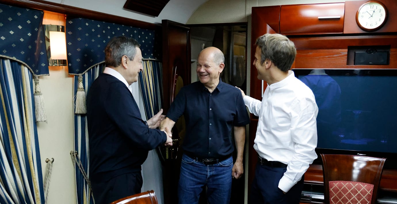 Frankrikes president Emmanuel Macron, Tysklands förbundskansler Olaf Scholz och Italiens premiärminister Mario Draghi har tagit tåget till Kyiv, och väntas träffa Ukrainas president Volodymyr Zelenskyj. Det skriver AP.