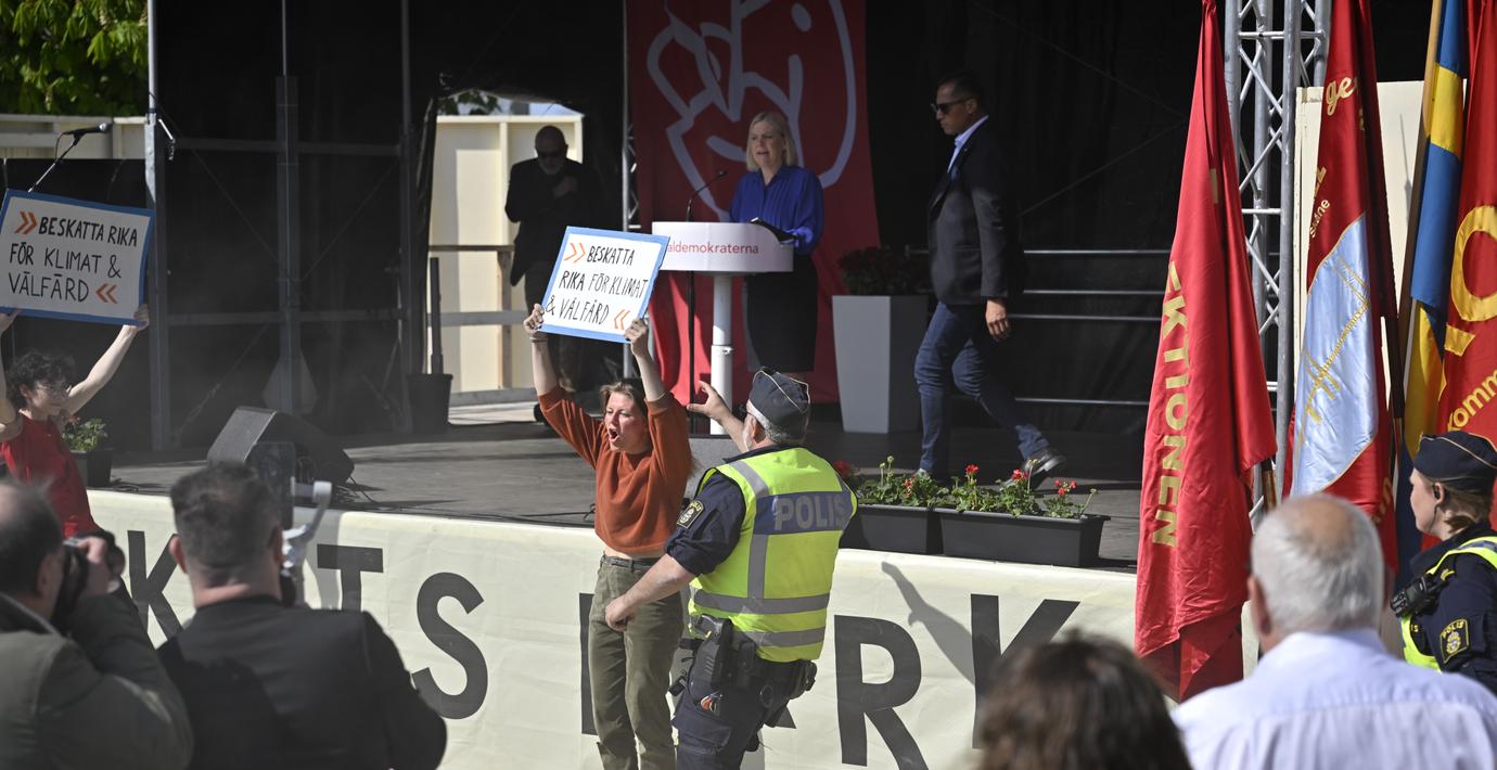 Socialdemokraternas partiledare Magdalena Andersson har i dag talat i Folkets park i Malmö. När hon talat i några minuter tog sig en person fram till scenen med en skylt med texten ”beskatta rika för klimat och välfärd”. Personen fick föras bort av vakter. Talet stördes också av personer som ropade mot scenen.