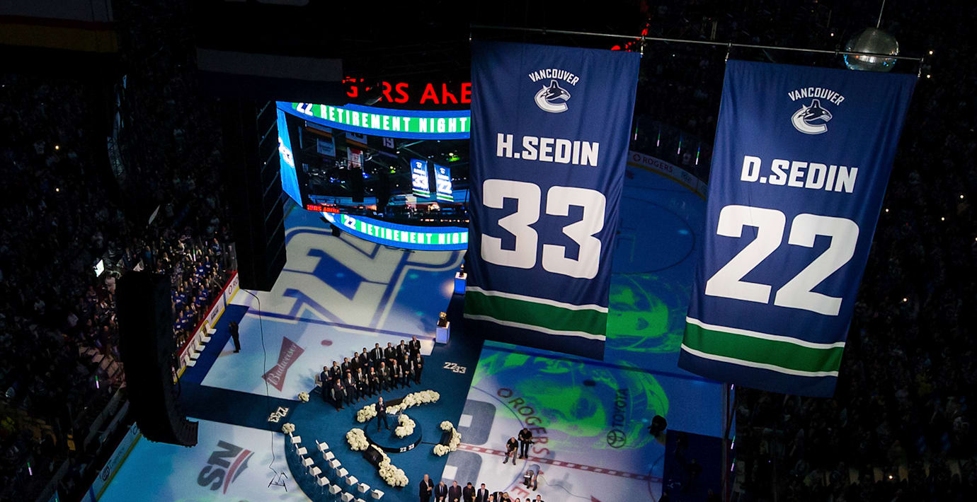 Daniel och Henrik Sedin fick ta emot en storslagen hyllning i Rogers Arena i Vancouver när deras tröjor hissades.