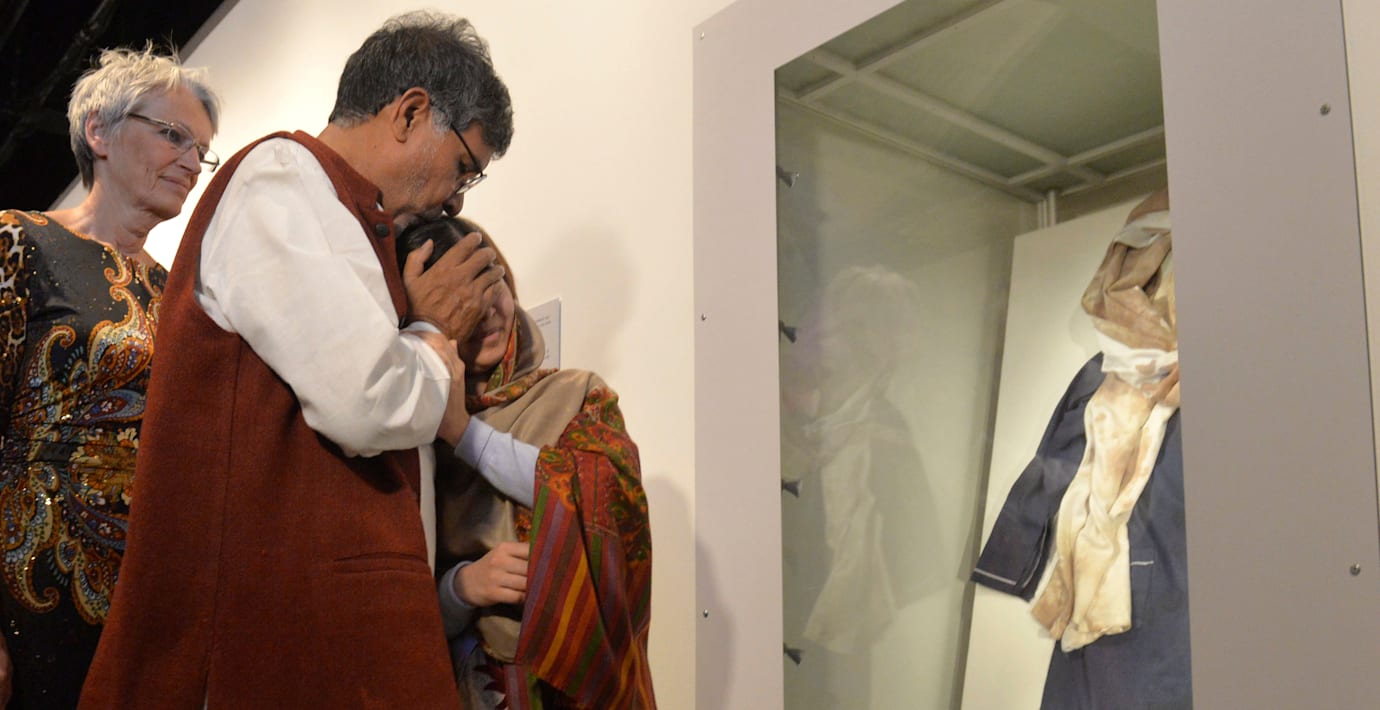 När Malala Yousafzai fick se sin gamla skoluniform – den hon bar under talibanernas attentat för två år sedan – brast fredspristagaren ut i gråt. Vid hennes sida under Nobelutställningen i Oslo fanns medpristagaren Kailash Satyarthi som tröstade 17-åringen.