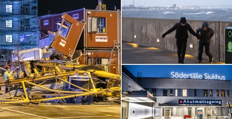 Stormen Malik nådde Sverige med full styrka under lördagskvällen och natten mot söndag. På Södertälje sjukhus rasade en byggnadsställning som krossade flera fönster och patienter fick flyttas, skriver Aftonbladet.