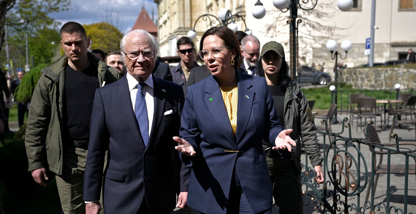 Utrikesminister Maria Malmer Stenergard (M) kommenterar desinformationen i ryska statsmedier om att kung Carl XVI Gustaf vägrade skaka president Zelenskyjs hand under sitt Ukrainabesök.