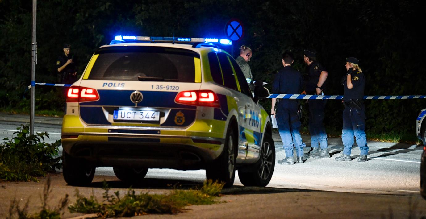 Polisen har upprättat avspärrningar och söker med helikopter efter misstänkta gärningsmän. Ingen har gripits.