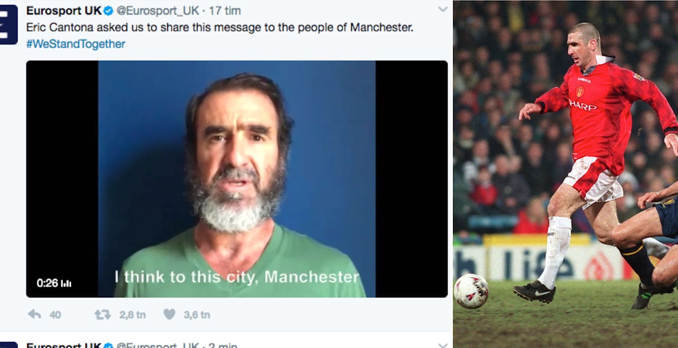 I ett känsloladdat videoklipp skickar den forne Manchester United-spelaren Eric Cantona sina kondoleanser till offren för terrorattacken i Manchester.