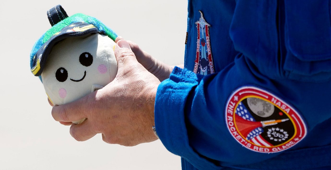 En av astronauterna håller i ”Rise”, den lilla maskoten för Artemis 2.