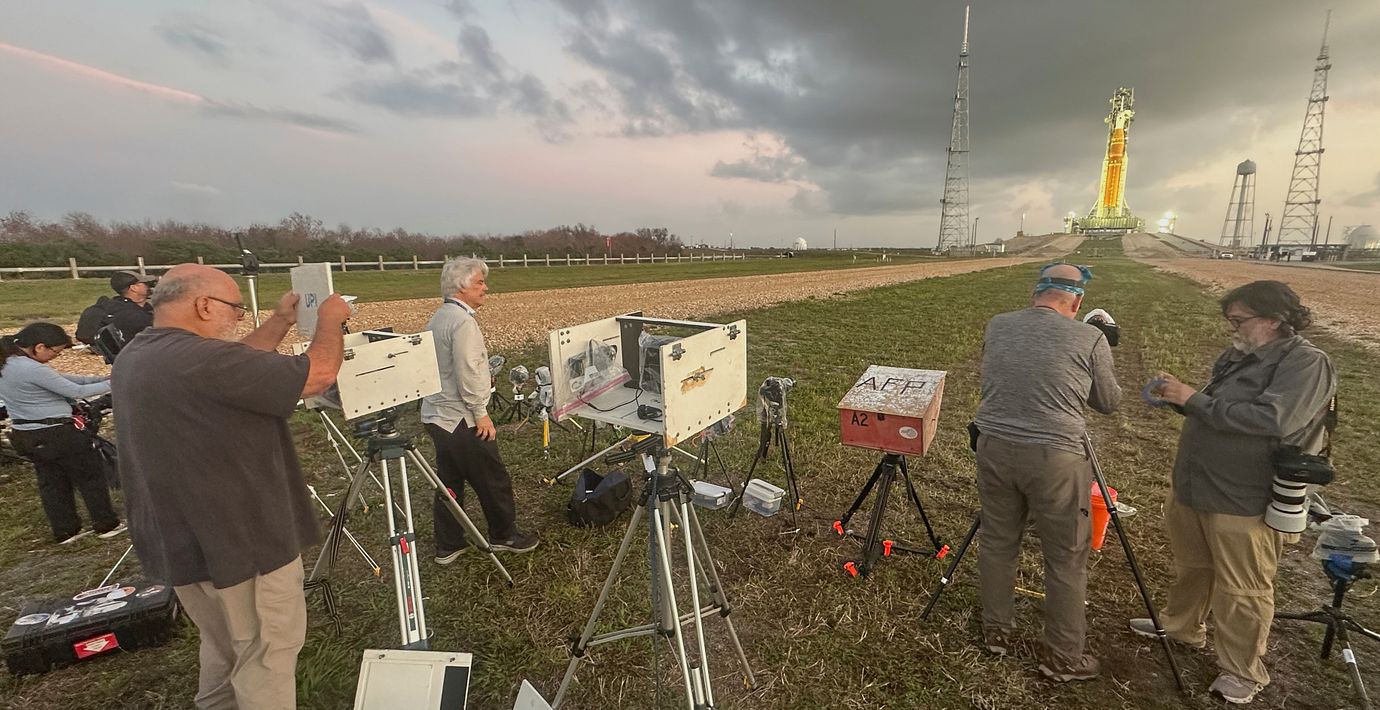 Fotografer placerar ut fjärrstyrda kameror inför uppskjutningen av Nasas Artemis 2-raket.