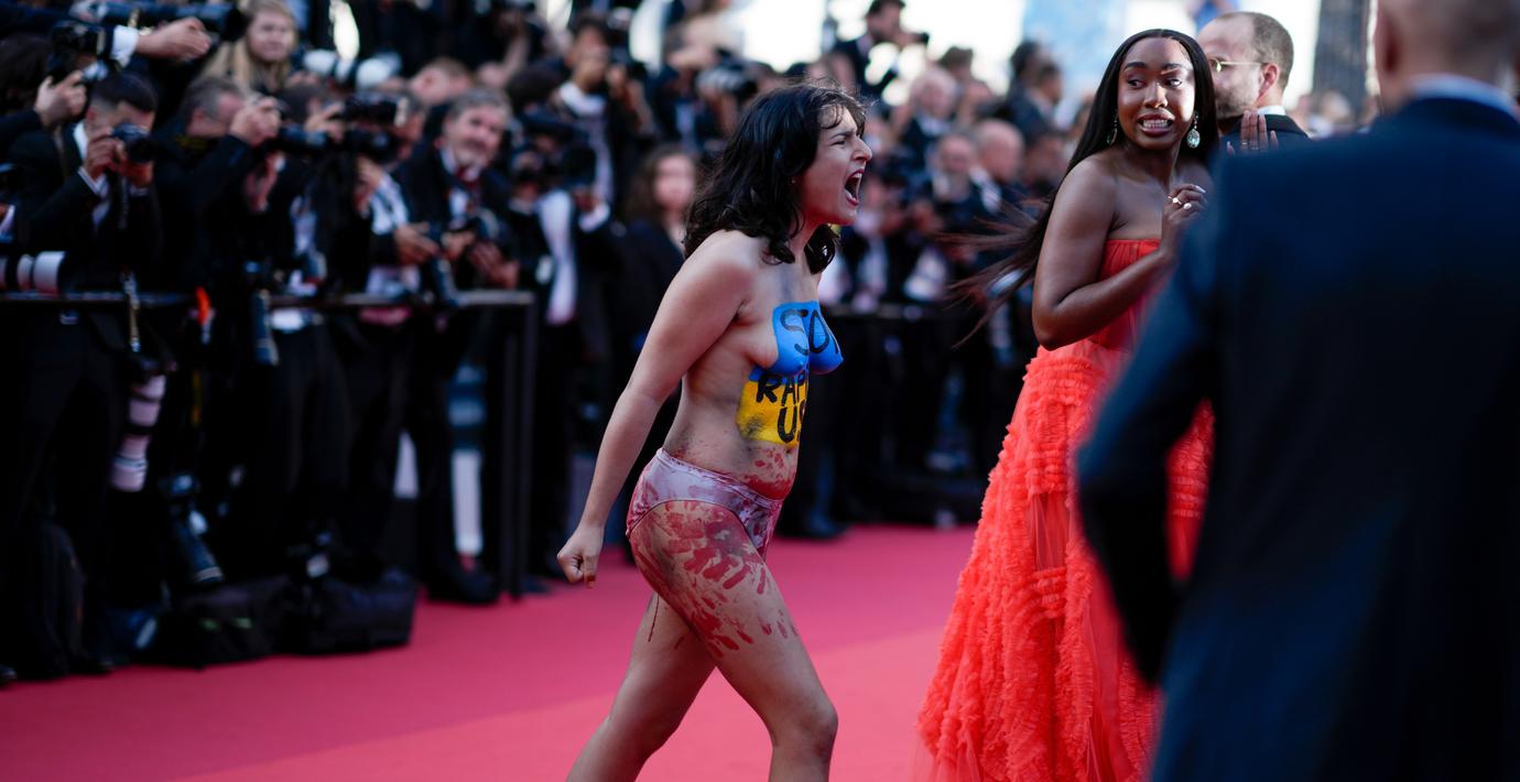 Under filmfestivalen i franska Cannes genomförde en kvinna på fredagen en manifestation mot våldtäkterna i krigets Ukraina, rapporterar AFP.
