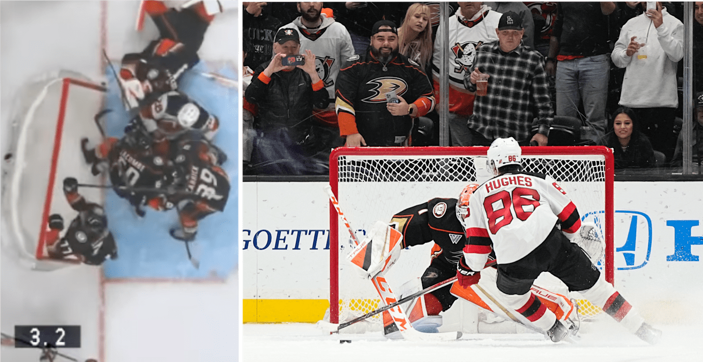 Matchen mellan Anaheim Ducks och New Jersey Devils stod 4–3 och såg ut att vara avgjord. Men då, med bara sekunder kvar, knuffade Ducks-forwarden Frank Vatrano medvetet den egna målburen ur sitt läge.