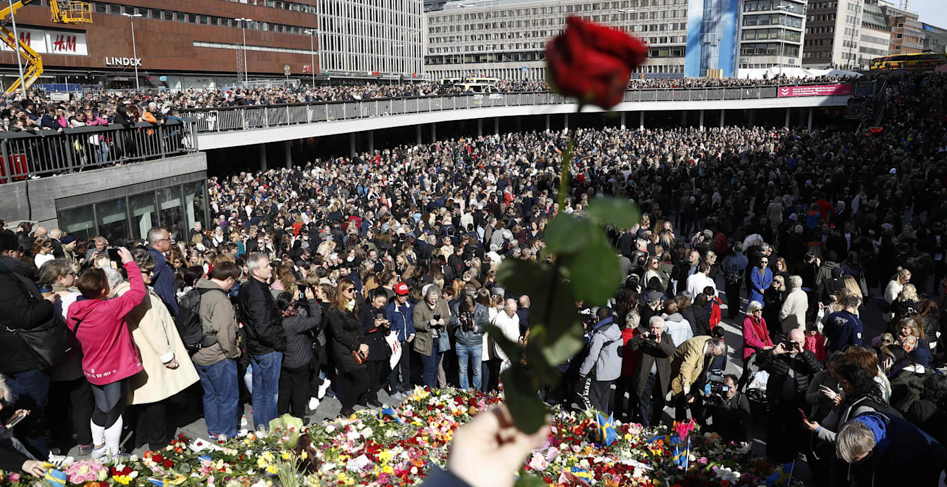 Tusentals människor höll armkrok på Sergels Torg i Stockholm för att hedra offren efter den misstänkta terrorattacken på Drottninggatan i fredags.
