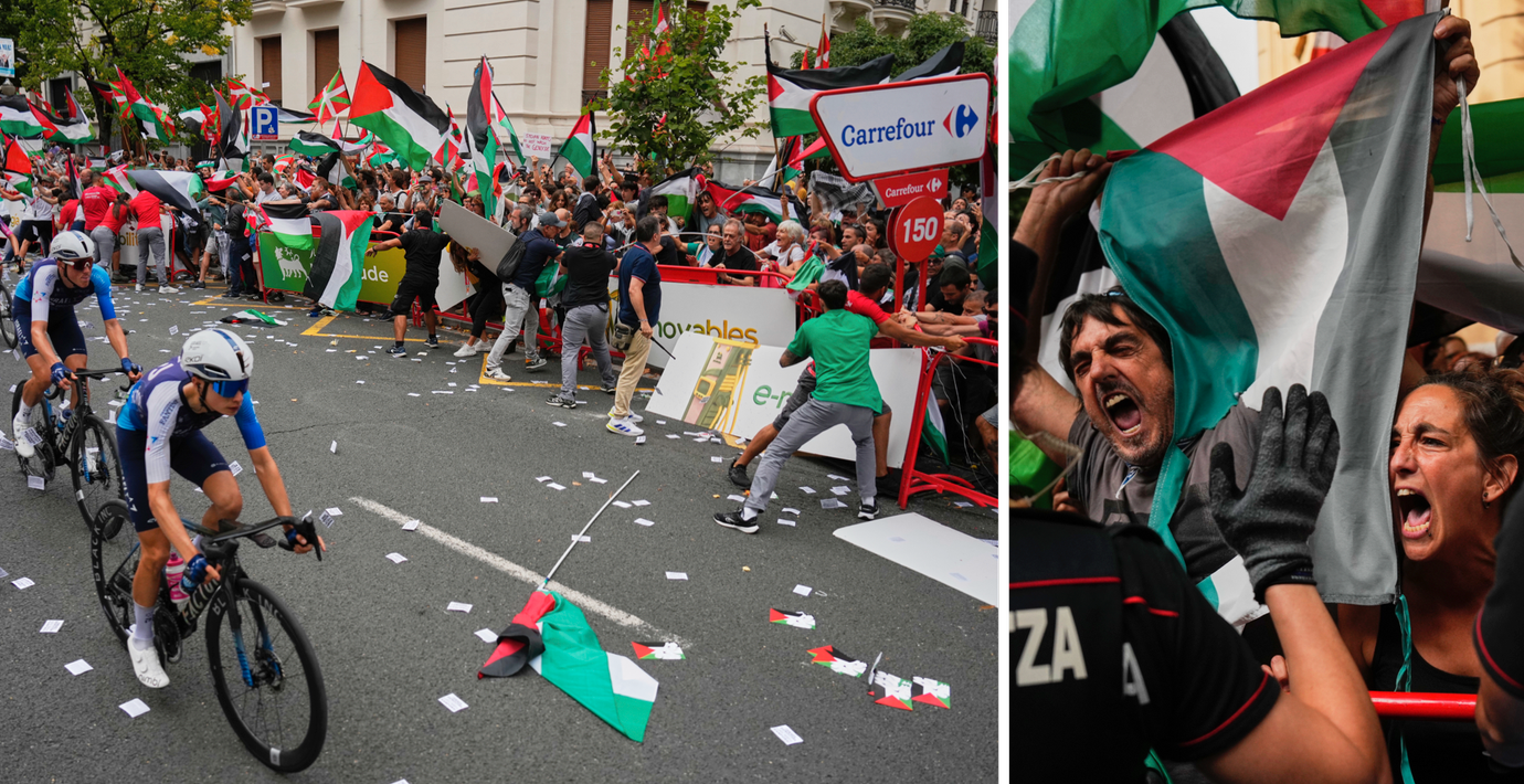 Cykeltävlingen Spanien runt skakas av protester mot att ett israeliskt lag tillåts delta. Under lördagens etapp samlades propalestinska demonstranter längs banan.