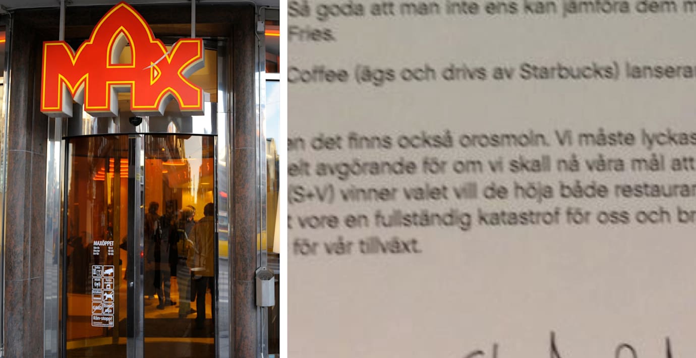 Företrädare för svenska restaurangkedjan Max Hamburgerrestauranger oroar sig för ett eventuellt regeringsskifte. I ett månadsbrev till sina anställda varnar de för oppositionens politik. ”Det är valår och om oppositionen (S+V) vinner valet vill de höja både restaurangmomsen och arbetsgivaravgifterna för unga. Det vore en fullständig katastrof”, står det bland annat. Inlägget kritiseras nu hårt i sociala medier.