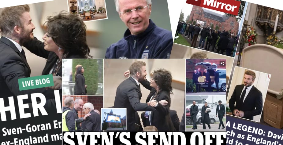 Att David Beckham och Svennis tidigare flickvän Nancy Dell’Olio är på plats i kyrkan har inte heller gått tidningarna förbi. ”Tillsammans i sorgen” lyder rubriken på The Suns artikel som bildsatts med en kram mellan Beckham och Dell’Olio.