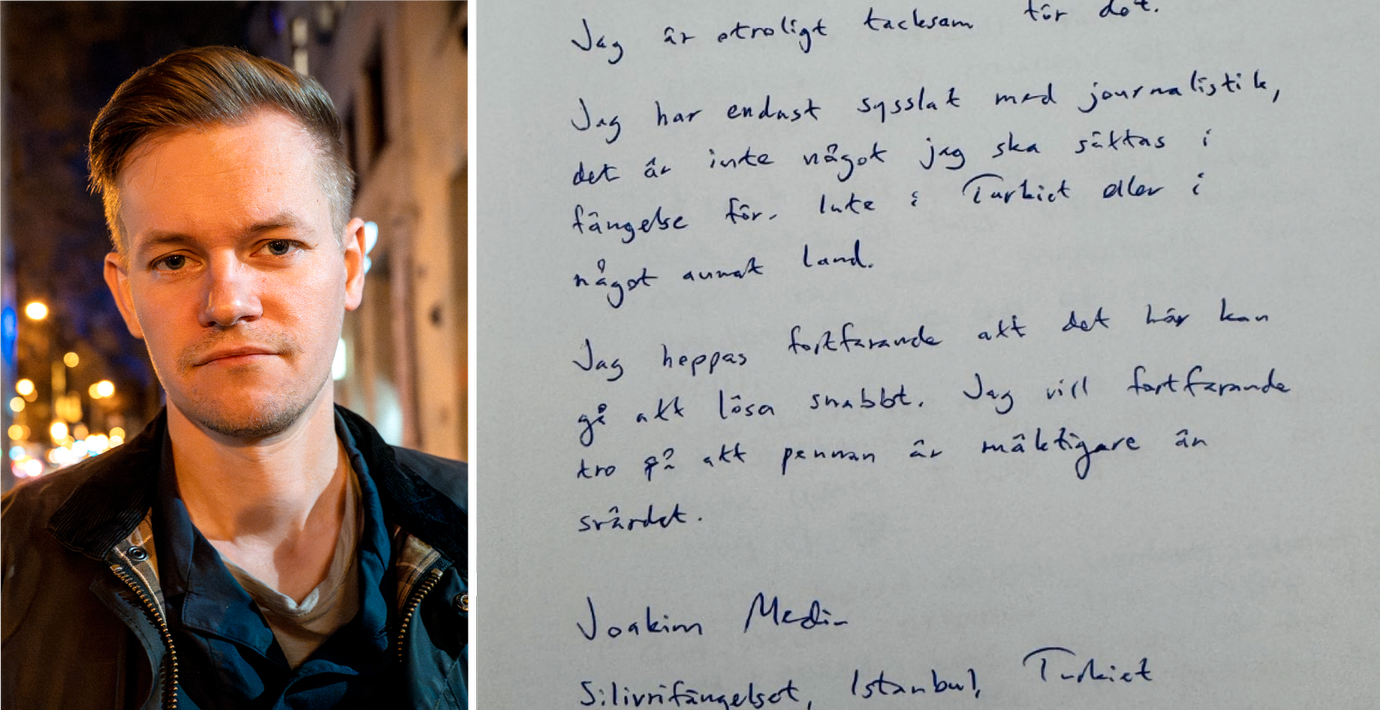 Det har gått två veckor sedan den svenske journalisten Joakim Medin greps och fängslades i Turkiet. I ett nytt brev från Silivrifängelset tackar han för allt stöd.