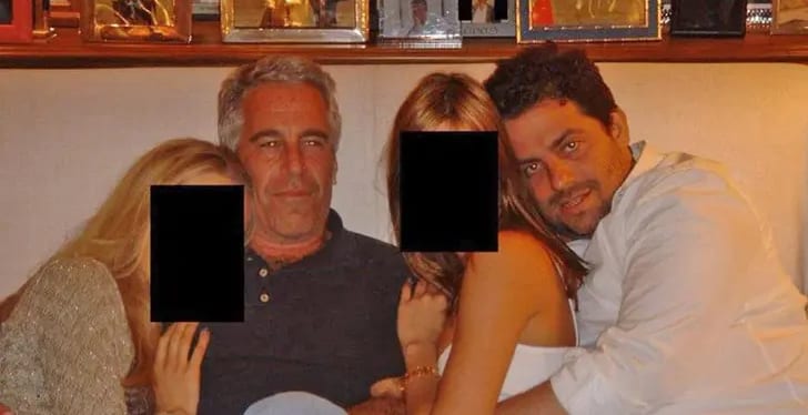 På bilderna sitter Ratner bredvid Epstein och flera kvinnor vars ansikten har maskerats.