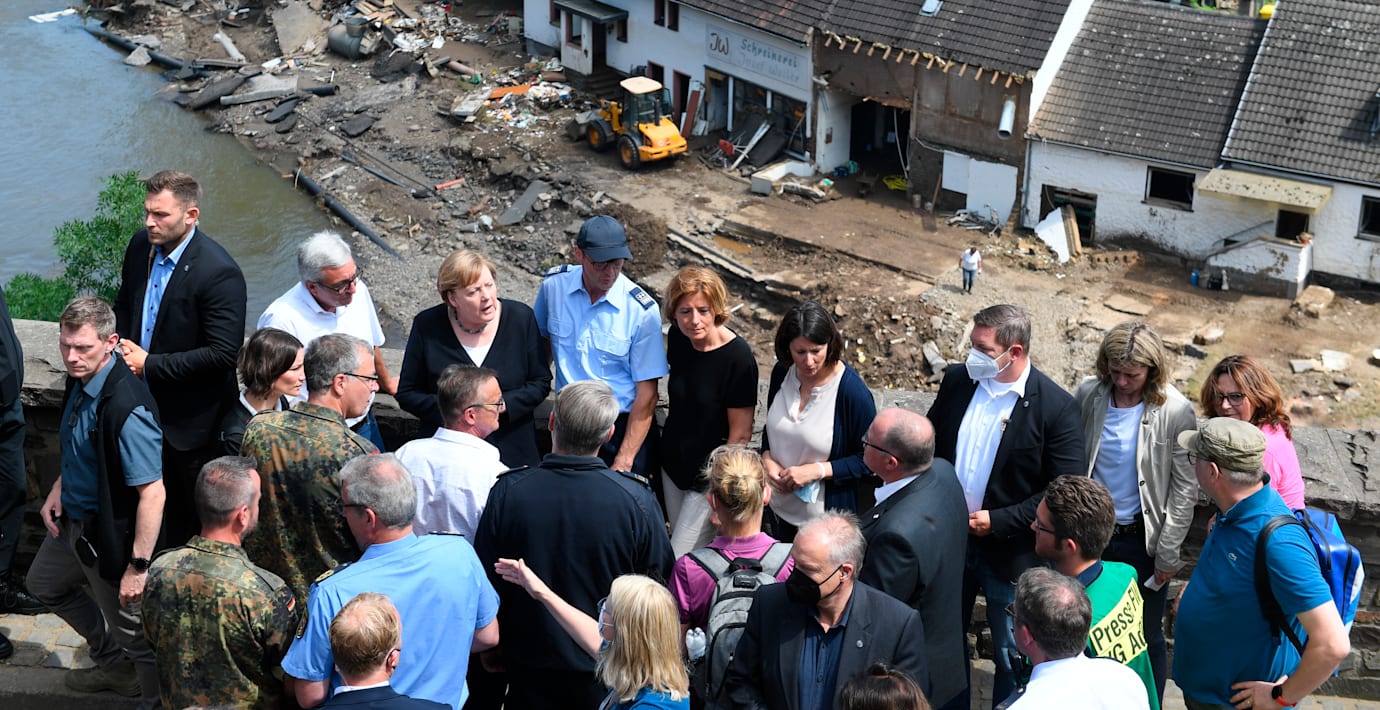 Tysklands förbundskansler Angela Merkel besöker i dag flera av de orter som drabbats hårdast av översvämningskatastrofen. Bland annat är hon i staden Schuld i delstaten Rheinland-Pfalz.