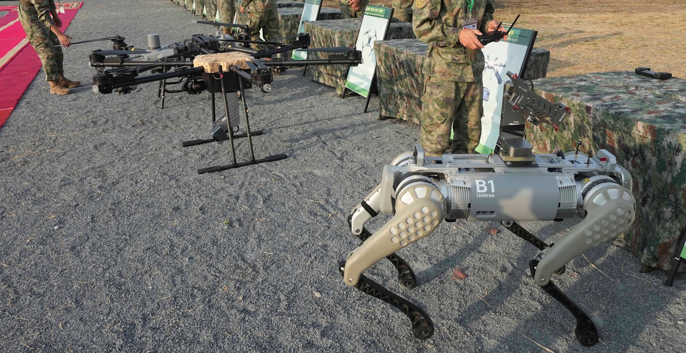 Kina och Kambodja använder sig av så kallade ”robothundar” under den stora militärövningen ”Gyllene draken”, rapporterar AFP. Journalister som var på plats under torsdagen fick titta på när soldaterna hanterade de fjärrstyrda fyrbenta robotarna med automatiska gevär monterade på ryggen.