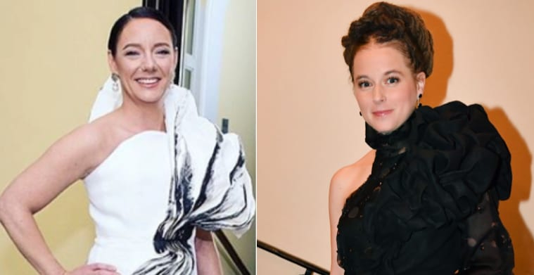Kulturministern Amanda Lind (MP) bär en klänning som ska symbolisera bränd mark efter skogsbränder.