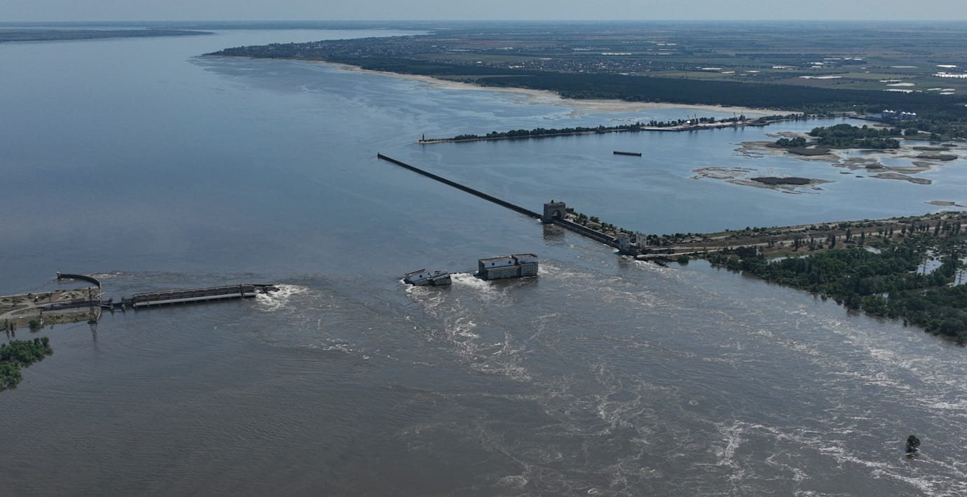The Kakhovka Dam in Ukraine was breached in the early hours of 6 June 2023, causing extensive flooding along the lower Dnieper river, also called the Dnipro, in Kherson Oblast. The dam was under the control of the Russian military, which had seized it in the early days of the Russian invasion of Ukraine. Many experts have concluded that Russian forces likely blew up a segment of the dam to hinder the planned Ukrainian counter-offensive. Russian authorities have denied the accusation.