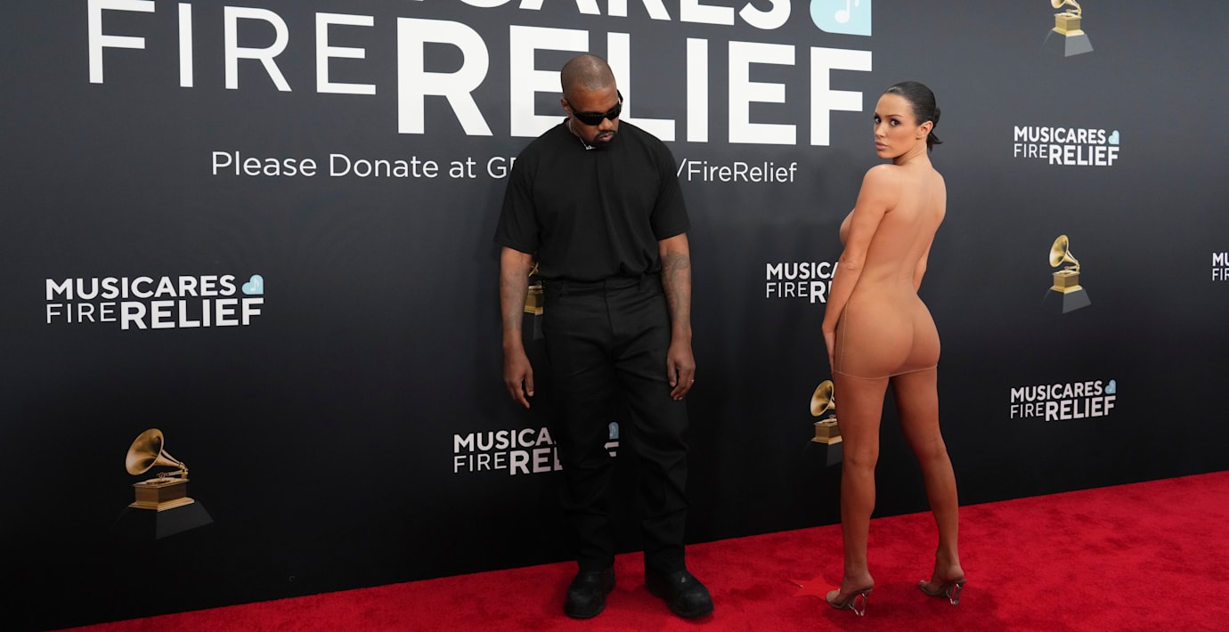 Bianca Censori, som är gift med den kontroversiella rapparen Kanye West, anlände till Grammygalan iklädd en stor päls. Men väl på röda mattan tog hon av sig jackan och stod näst intill naken inför kamerorna, skriver flera medier.