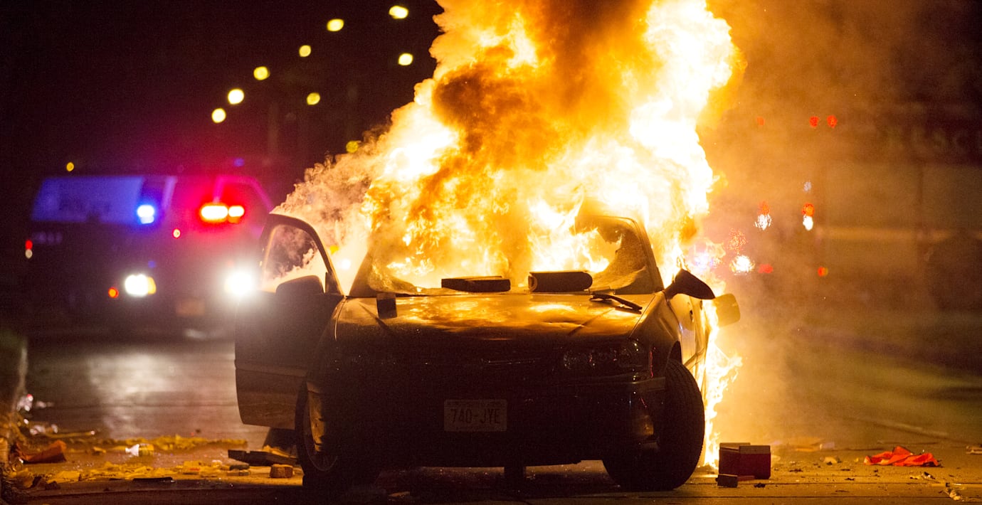 Bilar och butikslokaler sattes i brand och omkring 200 personer ska ha drabbat samman med kravallutrustad polis.