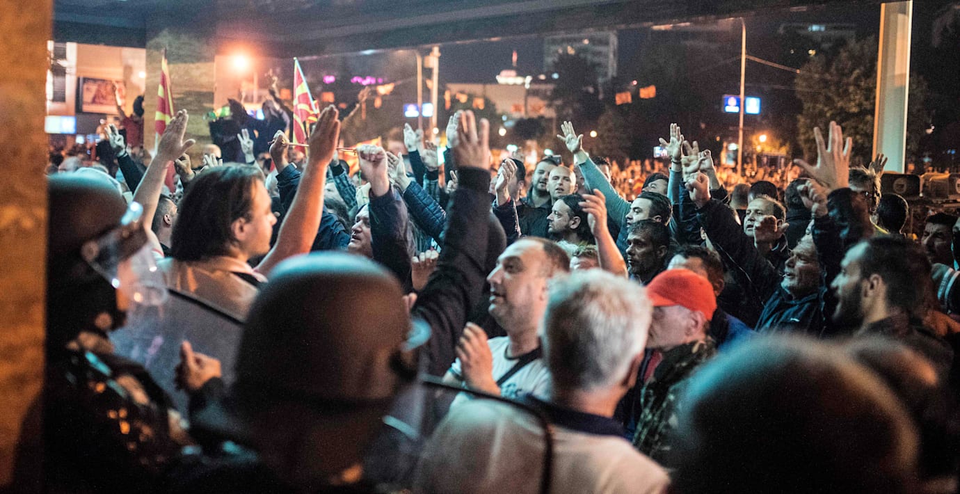 Polisen sköt chockgranater för att skingra de nationalistiska demonstranterna utanför parlamentet. Händelsen inträffade efter att Socialdemokraterna, tillsammans med proalbanska partier, utsett en talman från den albanska minoriteten.