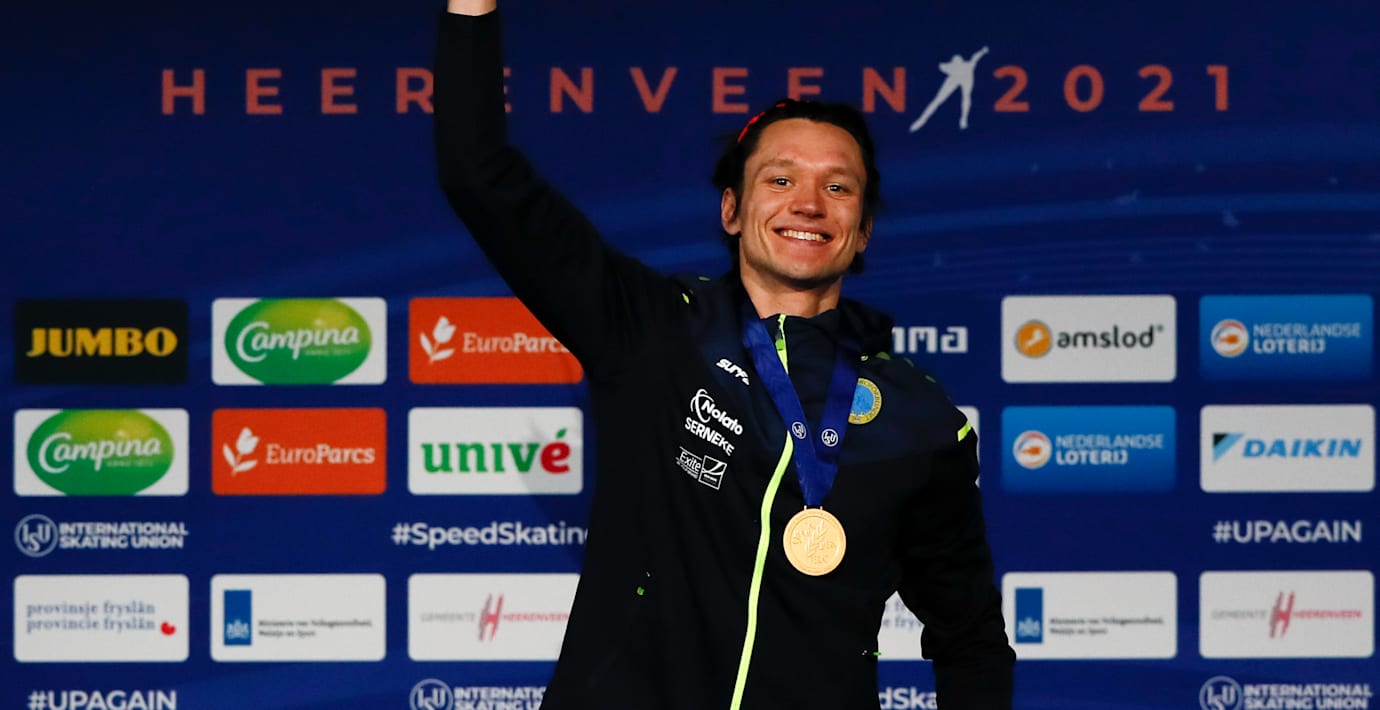 Den svenske skridskoåkaren Nils van der Poel hyllas efter guldet på 5 000 meter under VM i Nederländerna.