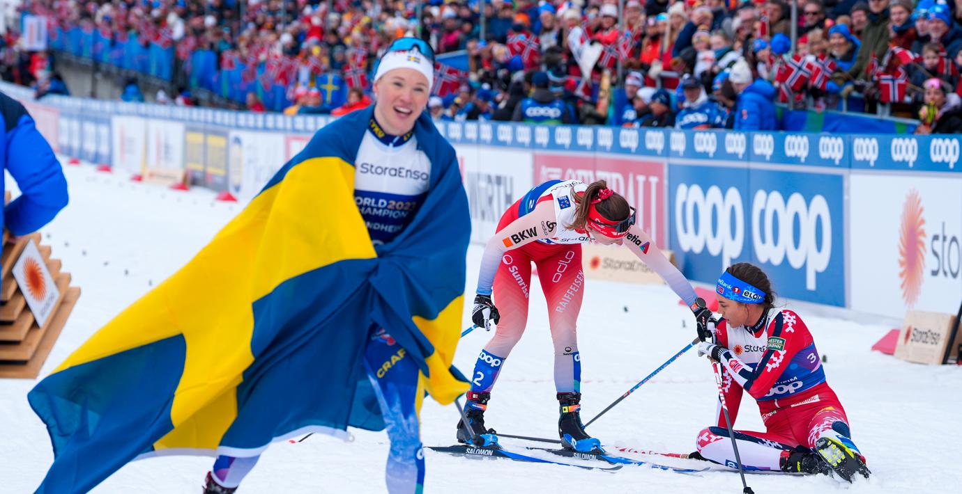 Hemmafavoriten Kristine Stavås Skistad fick se sig besegrad av Jonna Sundling i VM-sprinten. En knäckt norska tvingades sedan lyssna på svenska nationalsången under ceremonin i Trondheim.
