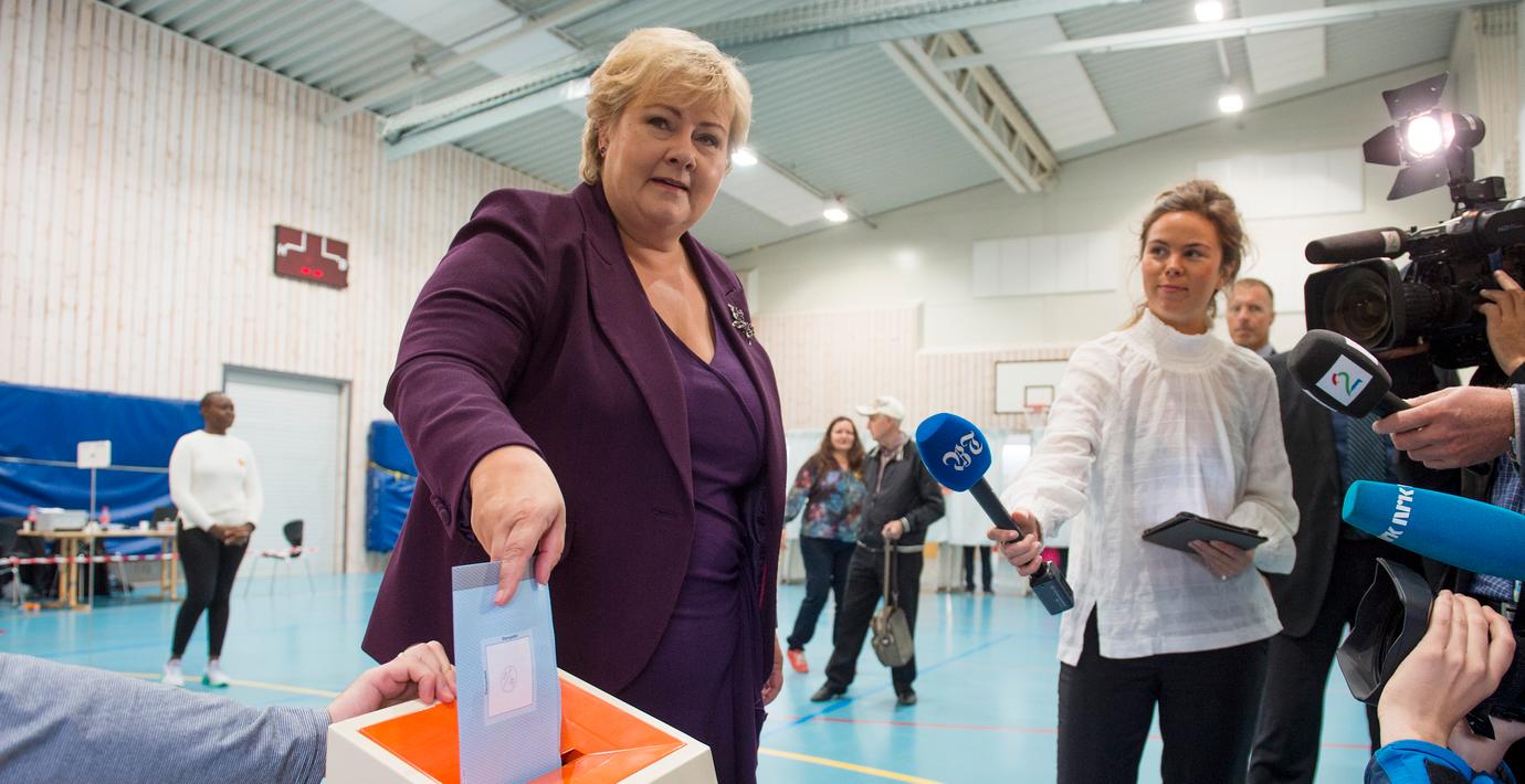 – I dag är det val, sade statsminister Erna Solberg som inte ville kommentera de dystra opinionssiffrorna när hon gick och röstade hemma i Bergen.