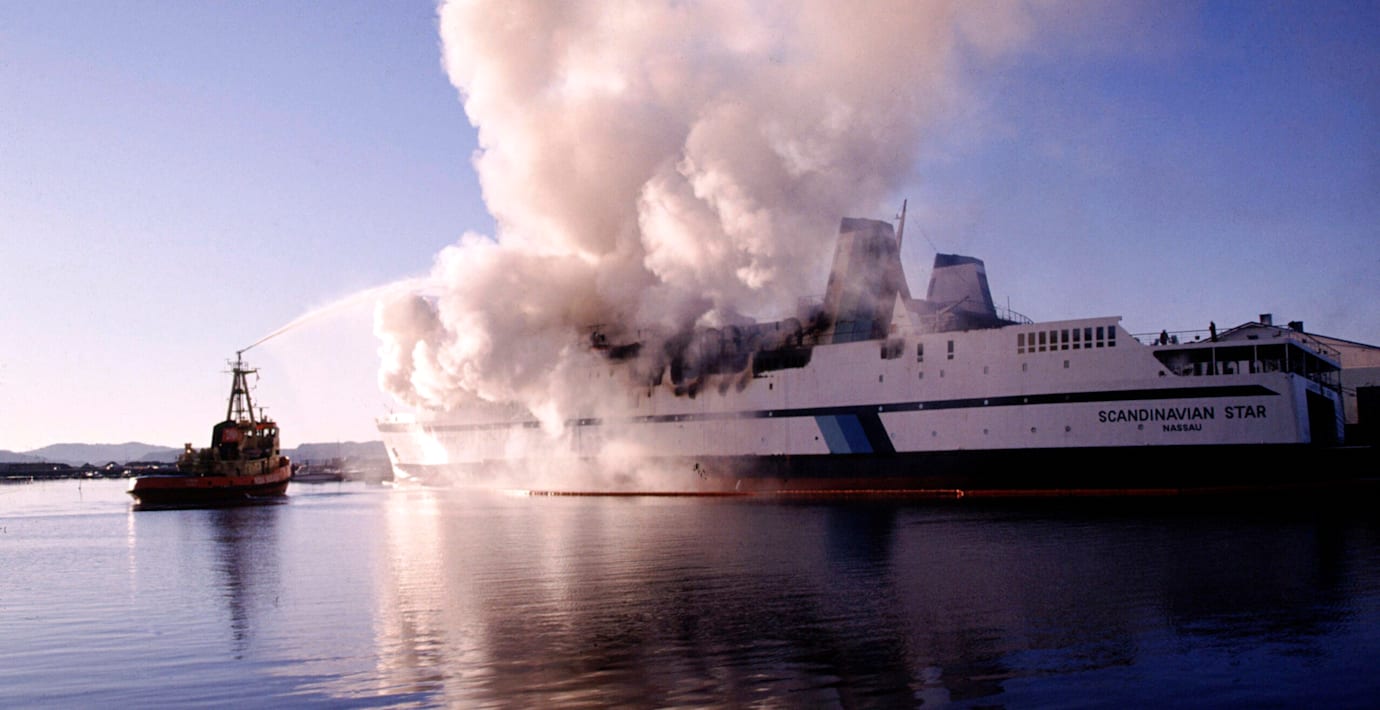 Branden bröt ut när färjan var på väg från Oslo till danska Fredrikshamn i april 1990.