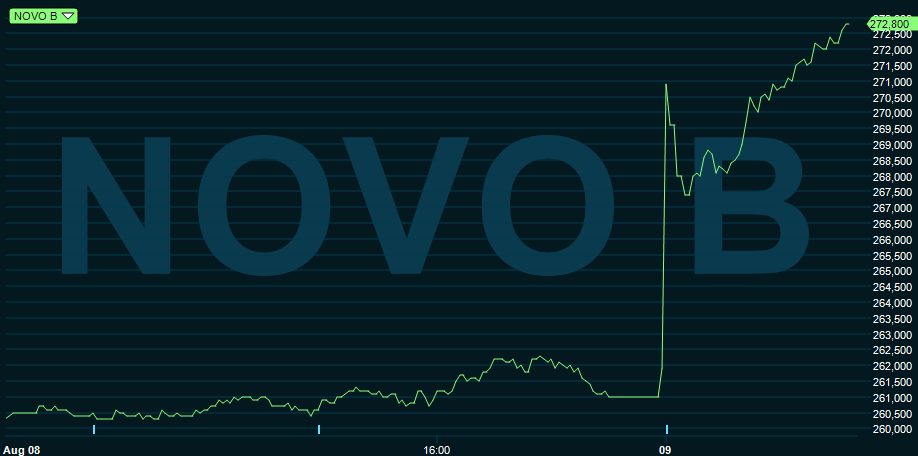 Novo Nordisks delårsrapport togs emot med öppna armar av investerarna som höjde bolagets aktiekurs med 7,9 procent på onsdagen. Det tunga bolaget lyfte Köpenhamnsbörsens C20-index som slutade 2,1 procent upp.