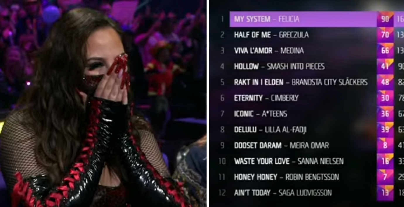 Storfavoriten Felicia vinner Melodifestivalen 2026. Hennes bidrag ”My system” fick flest poäng av den internationella juryn, och efter att även publikens röster delats ut står det klart att hon får representera Sverige i Eurovision Song Contest i Wien i maj.