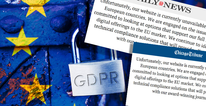 Flera stora amerikanska nyhetssajter, varav många tillhör mediejättarna Tronc och Lee Enterprise, har idag valt att göra sitt innehåll otillgängligt för europeiska användare. Detta då man ännu inte hunnit anpassa sig efter den nya europeiska dataskyddsförordningen GDPR. Det rapporterar Computer Sweden.