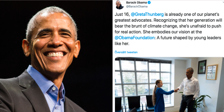 I inlägget syns även en bild på Thunberg och Obama som träffades under dagen i Washington DC. Den svenska klimataktivisten befinner sig i USA, dit hon seglade för några veckor sedan. Natten till tisdagen tilldelades hon även Amnestys pris ”Ambassador of conscience award”.