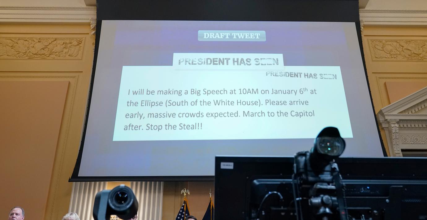 En opublicerad tweet från ex-presidenten Donald Trumps konto visades upp av den kommitté som utreder stormningen av Kapitolium under torsdagens utfrågning, rapporterar flera medier.