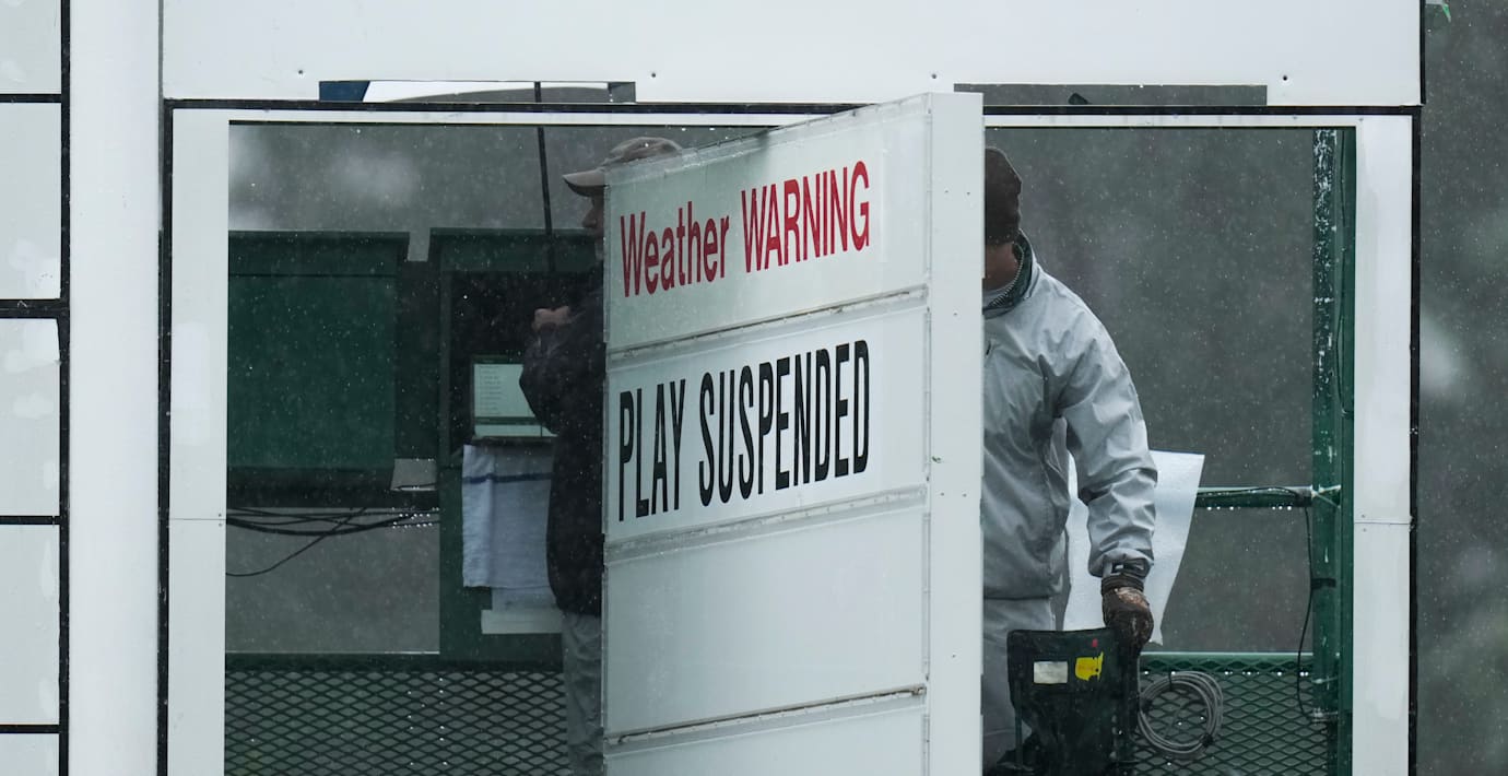 Den klassiska golftävlingen US Masters, tvingades på påskdagen ta en paus, skriver flera medier. Beslutet togs efter att ett kraftigt regnoväder omöjliggjort allt spel.