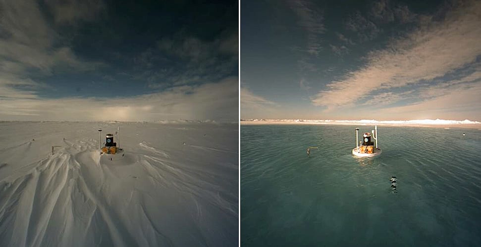 Bilder tagna av en webbkamera placerad av The Northpole Environmental Observatory visar hur isarna på Nordpolen smält dramatiskt under sommaren. Enligt observatoriet började jordens nordligaste punkt förvandlas till sjö från den 13 juli i år.