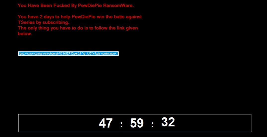 De två typer av ransomware som säkerhetsforskare identifierat kräver att användarna börjar följa Pewdiepie på Youtube. Verktygen för att låsa upp filerna på de drabbades datorer kommer däremot att släppas först när Pewdiepie passerar 100 miljoner följare, skriver man.