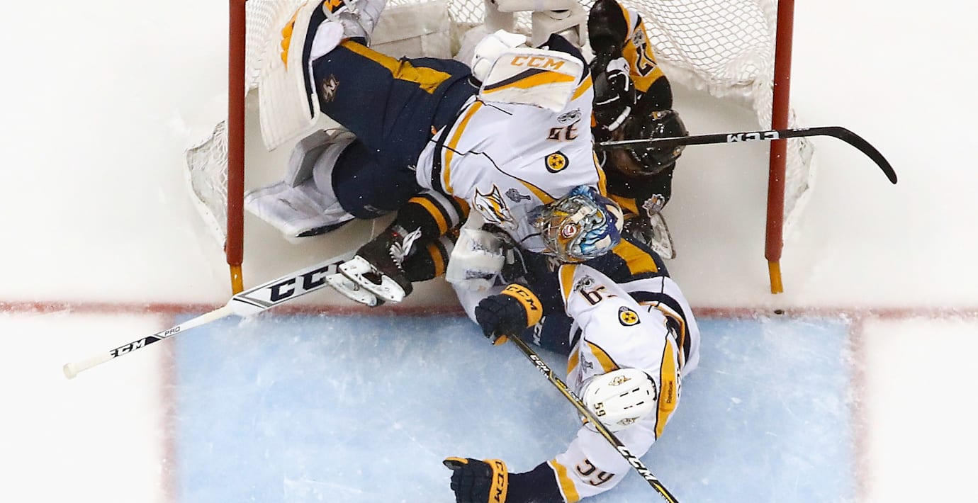 Med ytterligare ett mål under första perioden byttes målvakten Pekka Rinne ut. Men ersättaren Juuse Saros fick det inte lättare i andra perioden. Conor Sheary satte 4–0 redan efter 1.19, och därefter fyllde Phil Kessel och Ron Hainsey på. Den tredje perioden blev mållös men inte utan dramatik. Det uppstod bråk på isen när svenskarna Carl Hagelin och Viktor Arvidsson rök ihop i ett slagsmål och slog mot varandra.