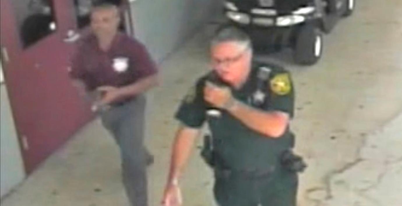 Övervakningsbilder visar att Peterson inte omedelbart ingrep, utan väntade utanför skolan i flera minuter innan han konfronterade skytten.